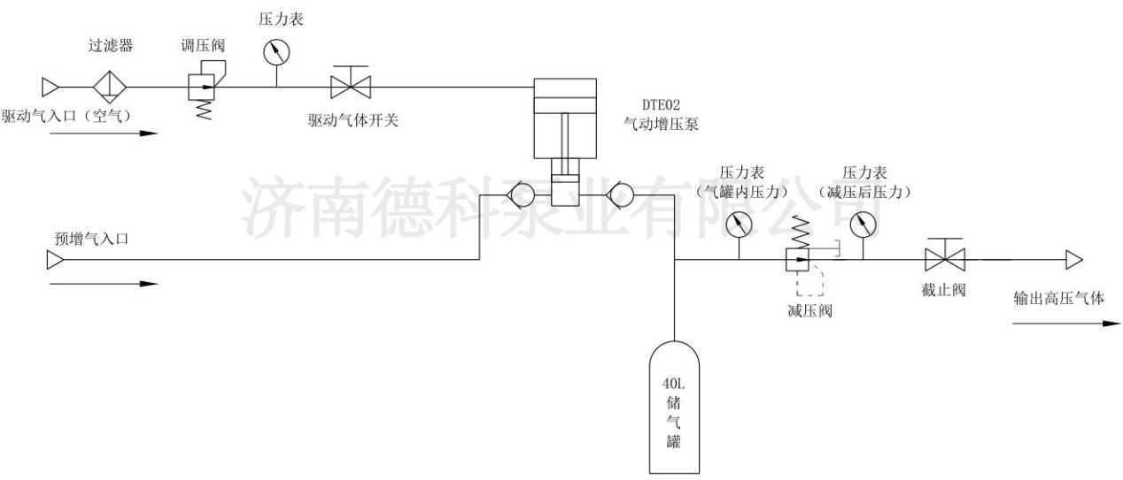 下圖是濟(jì)南德科生產(chǎn)銷售氣動(dòng)增壓系統(tǒng):氣動(dòng)增壓泵DTE02配40L儲(chǔ)氣罐